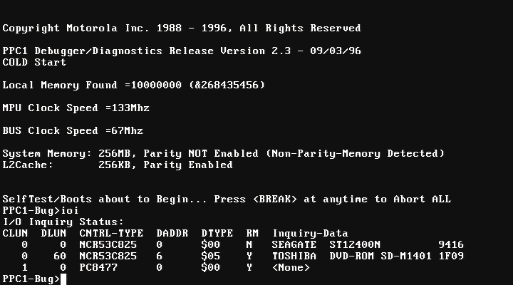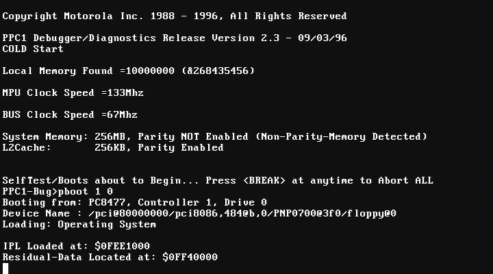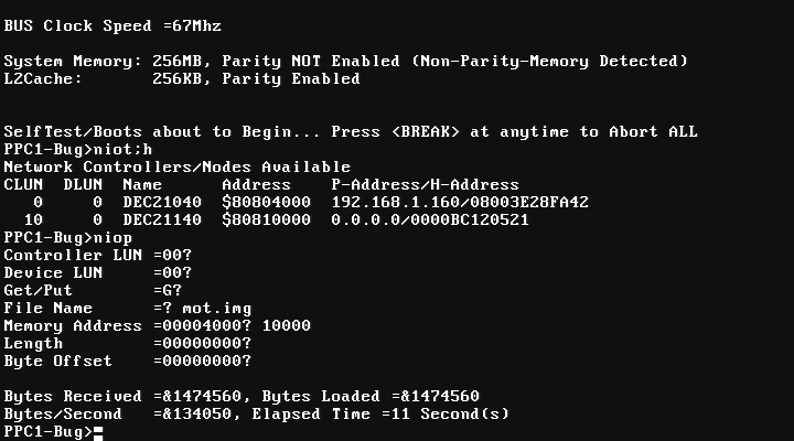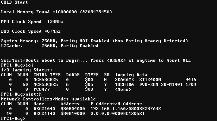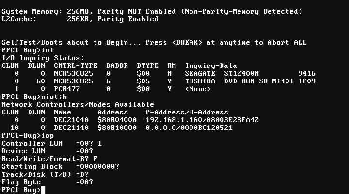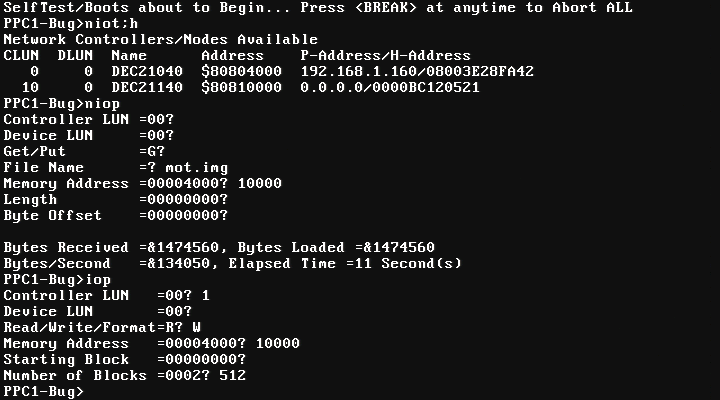 First, you will have to find a PPC1Bug suitable with 1600. MVME1600 compatible veirsions are PPC1Bug 1.0 through PPC1Bug 2.3 I've tested the installation with PPC1Bug 1.1, 1.9 and 2.3 How to display disk devices:Version 2.3 for example, supports DEC21140 ethernet chips (MPMC202), however MPMC202 causes Open Firmware not to load so if you have this PMC board remove it before booting the OS. If you are going to transfer the image over network you will need a MVME760 transition board or MPMC202. You can also transfer the image via Disk, CD, VMEbus etc... Displaying network adapters (here I have MPMC202), which I later removed:
