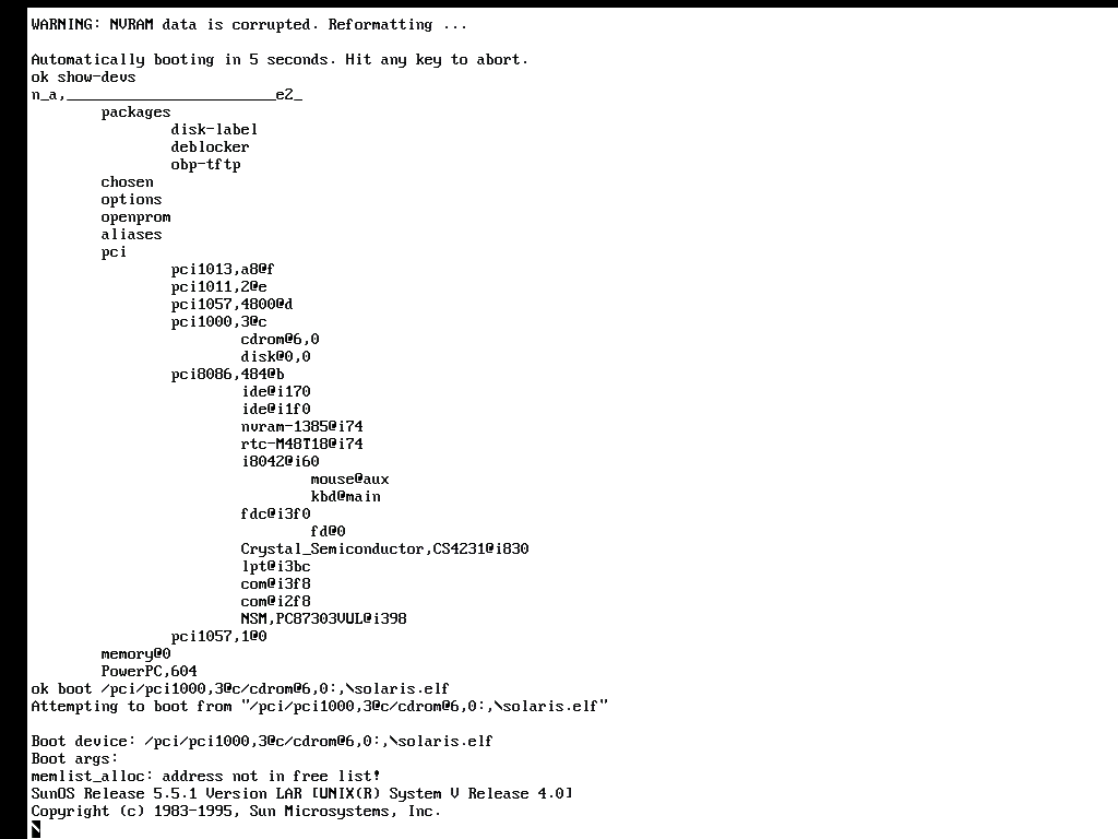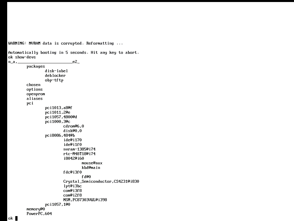 You are now into Sun's Virtual Open Firmware, which supports booting directly from the CD-ROM. Note, that you must press any key within 5 seconds to disable the auto-boot procedure. To list the devices use show-devs at the ok prompt. As you may noticed, VOP (Virtual Open Firmware) doens't detect the board architecture correctly. Sun added official support in VOP 2.0 although I wasn't able to boot from the cd. It could be a part of the unfinished Solaris 2.6/ppc.